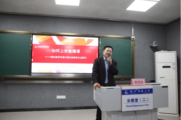 上午9:00培训准时开始,由教务处邹莉处长主持,蒋国珍教授首先以“怎样上好直播课”为题从“关于“上好课” ,您的看法?”、“什么样的直播有可能替代面授“和”新的教学环境与教改研究”三个方面分享了上好直播课的意义、方法及注意事项等。蒋教授朴实的语言,生动的比喻、真实的案例,引起了大家的强烈共鸣。现场气氛热烈,老师们在和蒋教授的互动交流中不断加深对直播课的本质又有了新的理解。