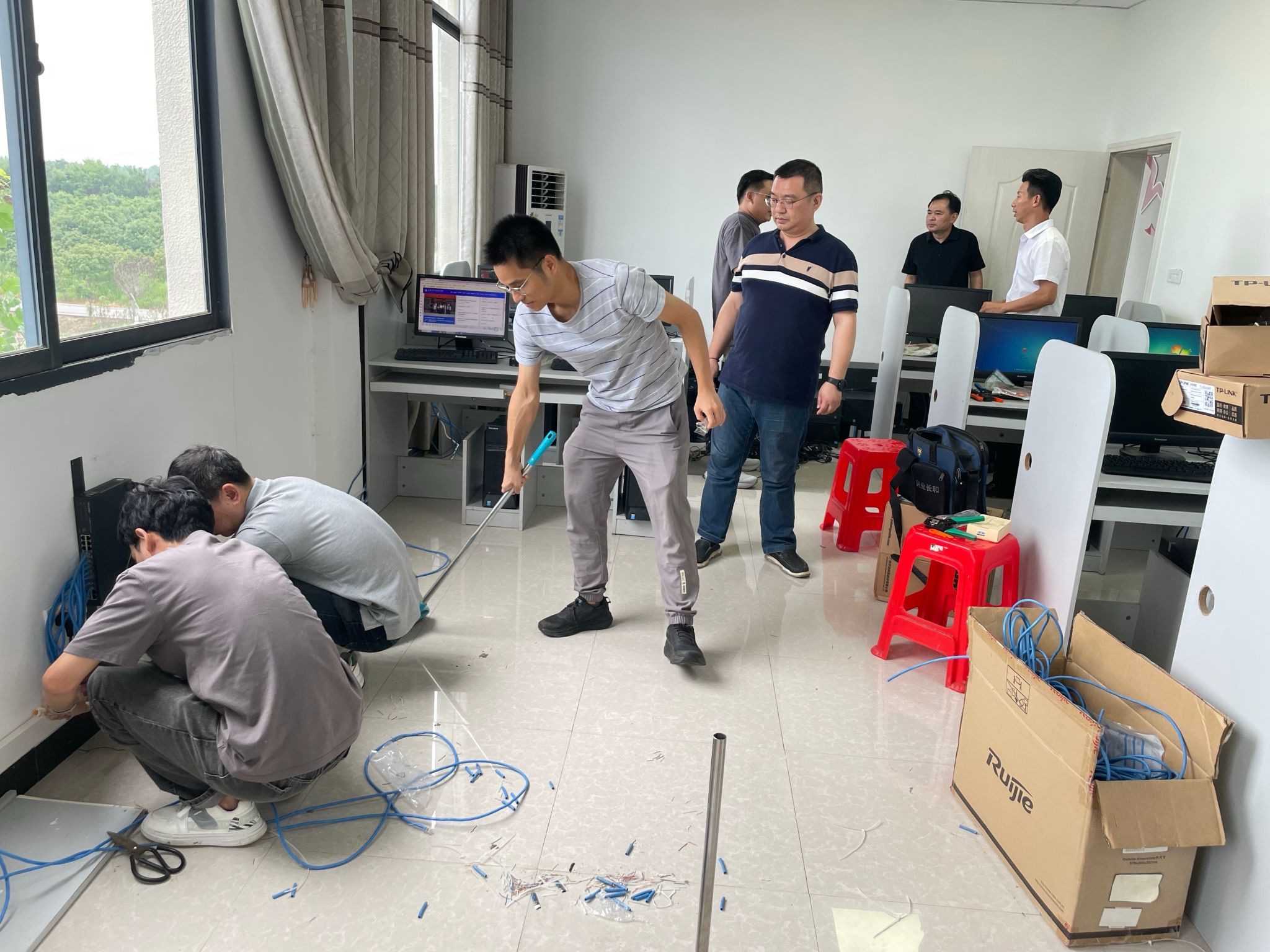 2024年7月16日早上八点,党员同志们从学校出发,经过两小时车程来到对口帮扶的刘湾村村委会,党员干部们迅速行动起来,和专业技术团队以及村委沟通协作,经过六小时的紧张施工,培训中心的网络布线工作顺利完成。