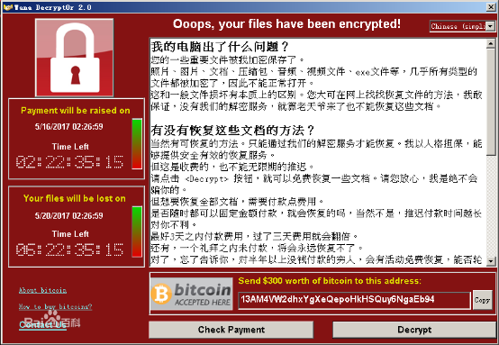 WannaCry(又叫Wanna Decryptor),一种“蠕虫式”的勒索病毒软件,大小3.3MB,由不法分子利用NSA(National Security Agency,美国国家安全局)泄露的危险漏洞“EternalBlue”(永恒之蓝)进行传播。勒索病毒肆虐,俨然是一场全球性互联网灾难,给广大电脑用户造成了巨大损失。最新统计数据显示,100多个国家和地区超过10万台电脑遭到了勒索病毒攻击、感染。勒索病毒是自灰鸽子和熊猫烧香以来影响力最大的病毒之一。WannaCry勒索病毒全球大爆发,至少150个国家、30万名用户中招,造成损失达80亿美元,已经影响到金融,能源,医疗等众多行业,造成严重的危机管理问题。中国部分Windows操作系统用户遭受感染,校园网用户首当其冲,受害严重,大量实验室数据和毕业设计被锁定加密。部分大型企业的应用系统和数据库文件被加密后,无法正常工作,影响巨大。